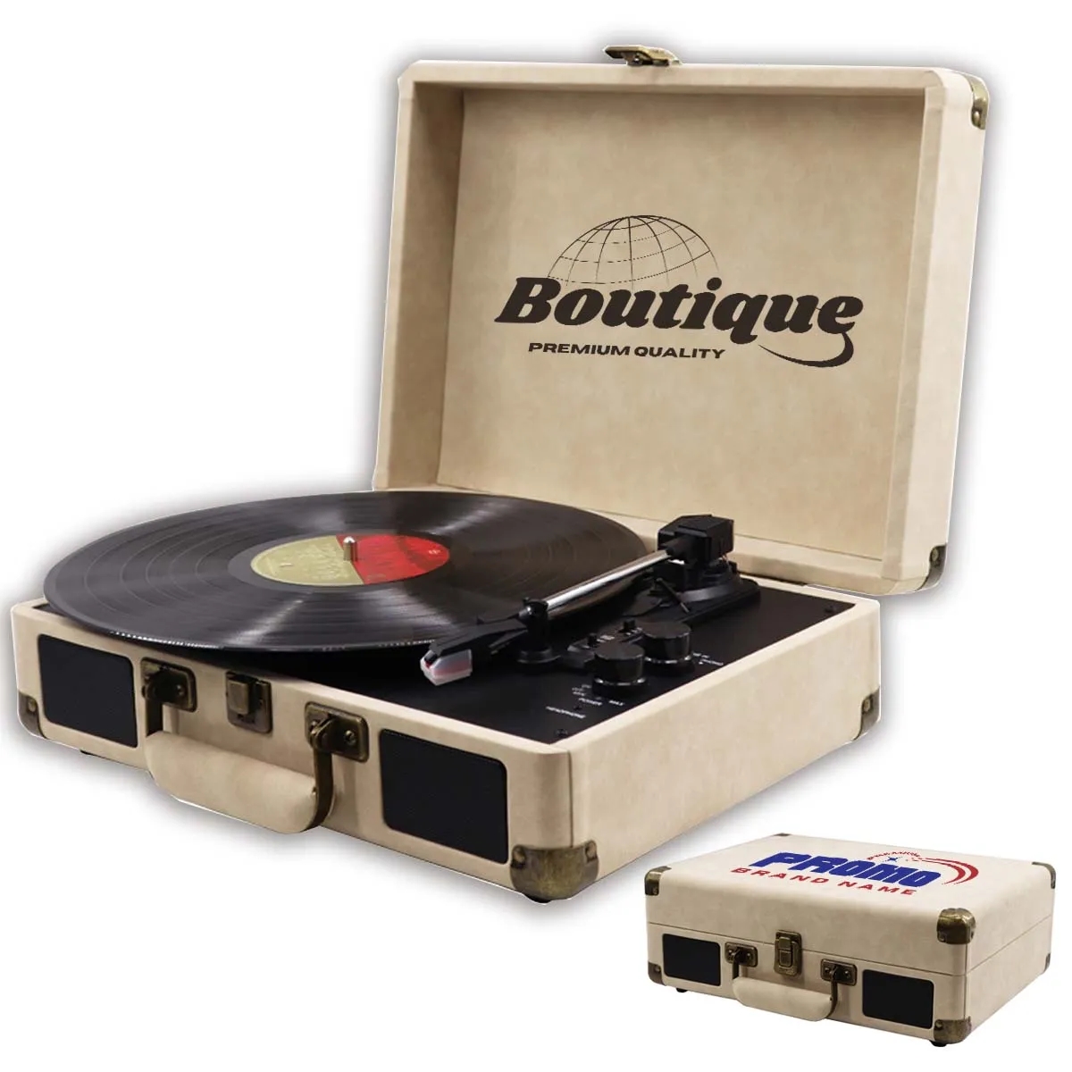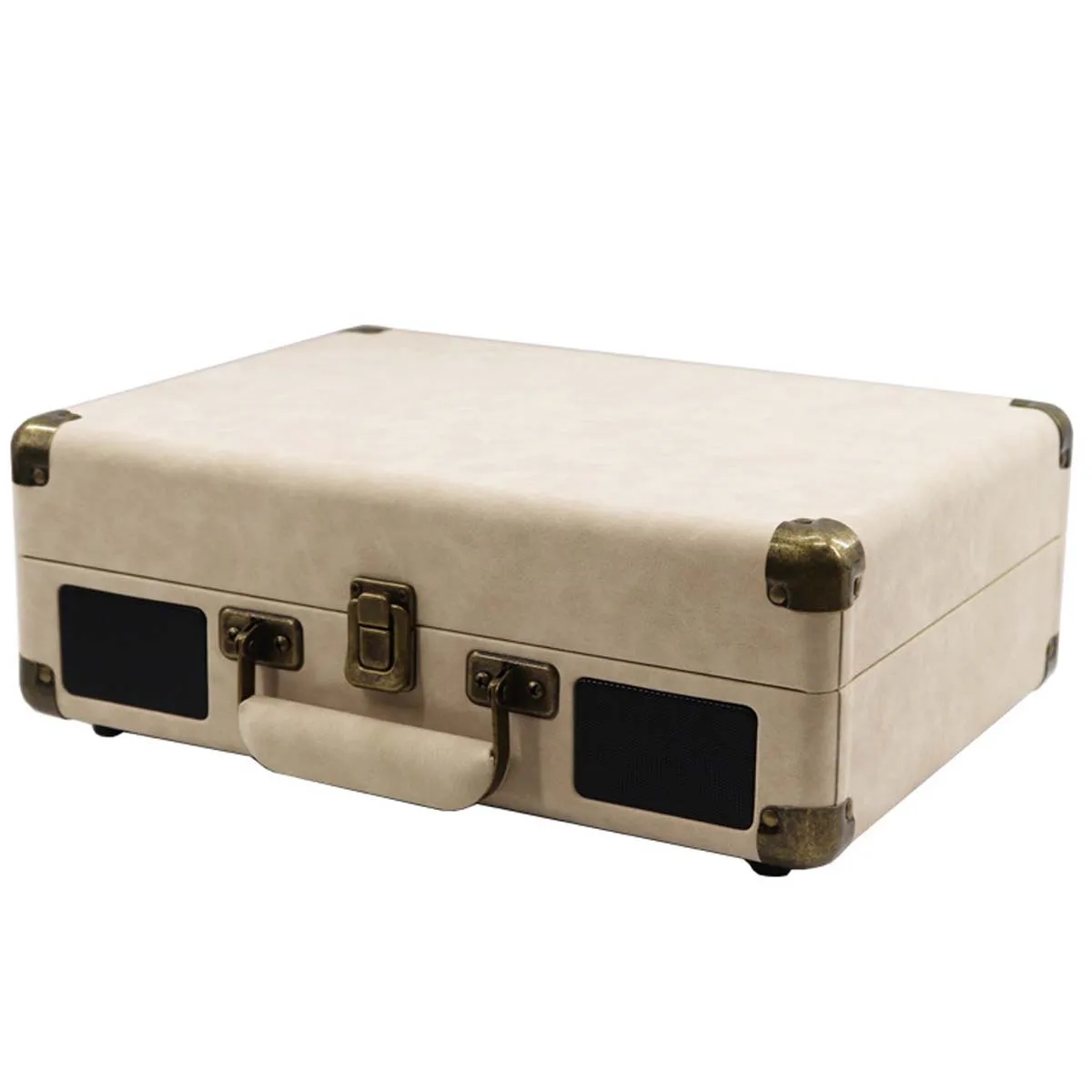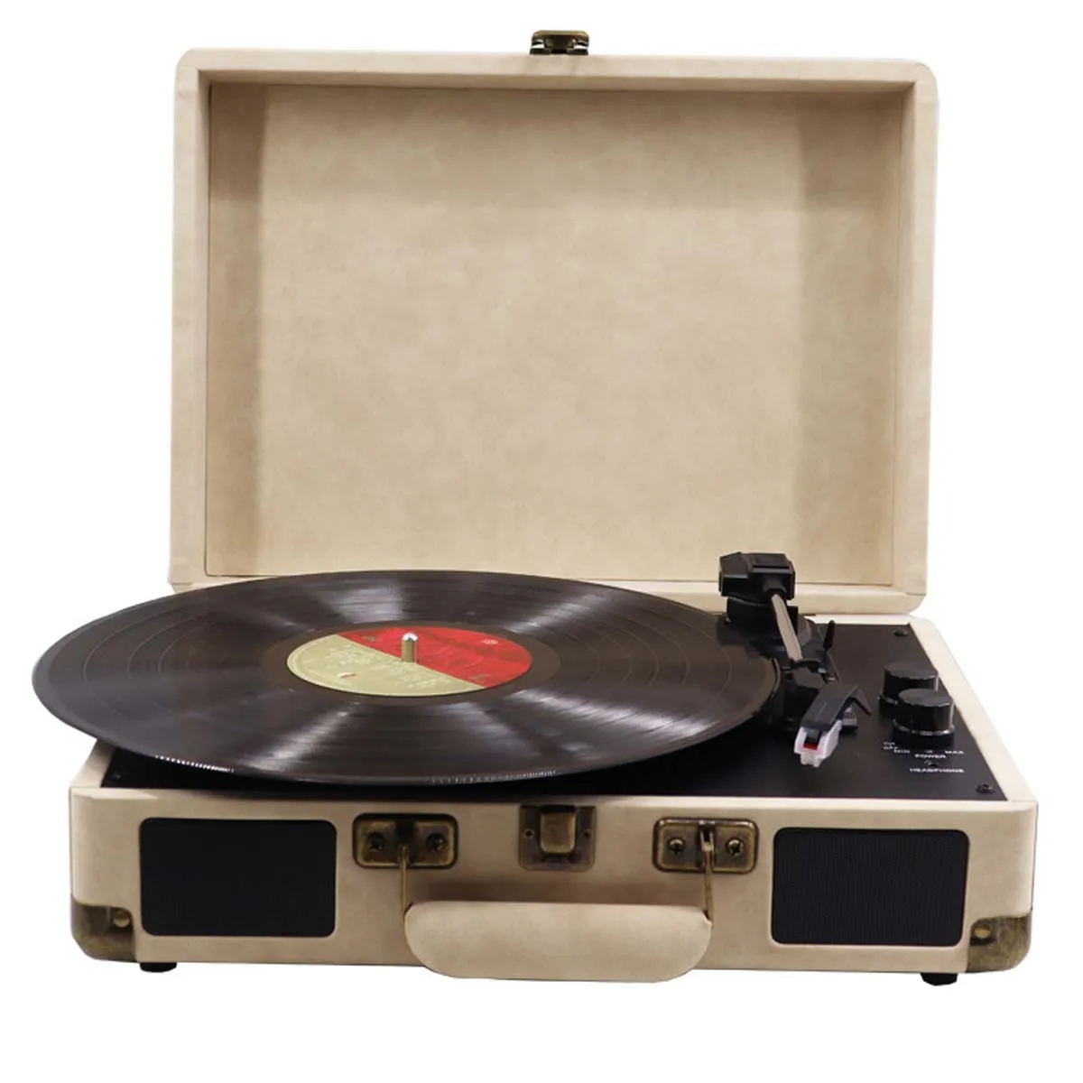 This 3-speed (33 1/3, 45, 78 rpm) suitcase record player features and sits on sound isolating feet that prevent vibration.It is perfect for your living room, bedroom or office.Stream smartphone audio through the turntable's built-in Bluetooth speakers.Easily connect external speakers via the stereo RCA outputs, or use the Line input for non-Bluetooth devices like a CD player.For personal listening, connect your headphones to the headphone jack.Retro looks combined with the convenience of modern technology makes this affordable record player ideal for beginners & vintage enthusiasts.Features an Input select knob, Power/Volume Knob & an Auto stop switch that stops spinning records once the record is finished playing.KEYWORD:Entertainment Home Decoration,Birthday All-in-one Three,Nice Playee.